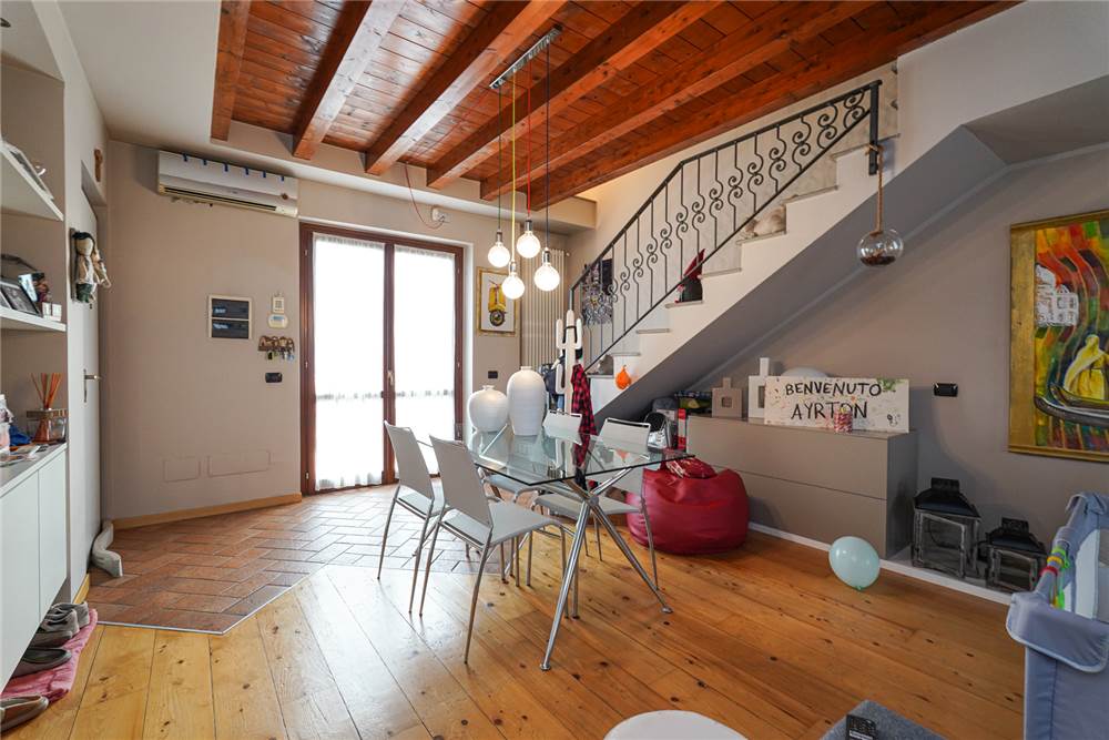 Ingresso indipendente, giardino privato con scala esclusiva che sale a piano primo, terrazzo, soggiorno ampio con zona living, cucina abitabile di importante metratura, antibagno e bagno con doccia e vasca, scala che accede a piano primo travi a vista interne, due camere letto, balcone.